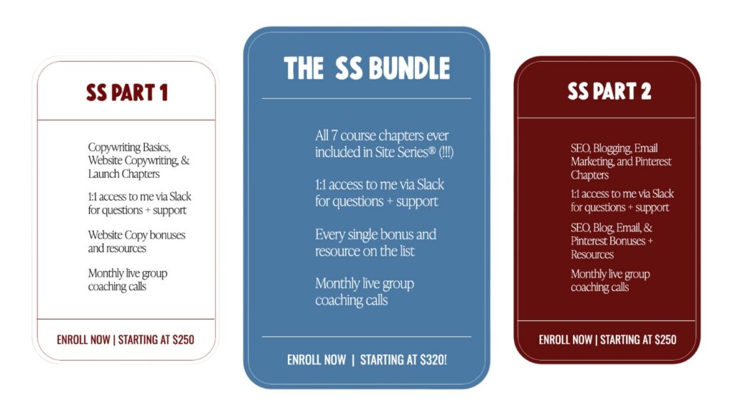 She also just re-released her famous copywriting/SEO/E-mail Marketing/Pinterest/Blogging (yes.. all that…) course called THE SITE SERIES and it’s on sale only until Nov. 21st. and includes a 1:1 call with her if purchased during the sale!